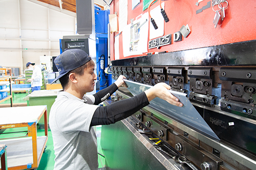 私は製造部の板金課を担当しています。主な業務はプレス機を使い、ステンレス板を図面通りに折り曲げる作業です。当社は社員1人1人のスキルを上げることにより休みを取りやすい環境作りを推進しており、どの社員も幅広いスキルを身に付け、誰かが休暇を取った時にはフォローに入ったりもします。私自身も板金課においてプレス機以外にもレーザー加工機やバリ取り機の作業も行える他、以前は組立課に配属されていた経験もあり、組立作業の応援に入ったりすることもあります。