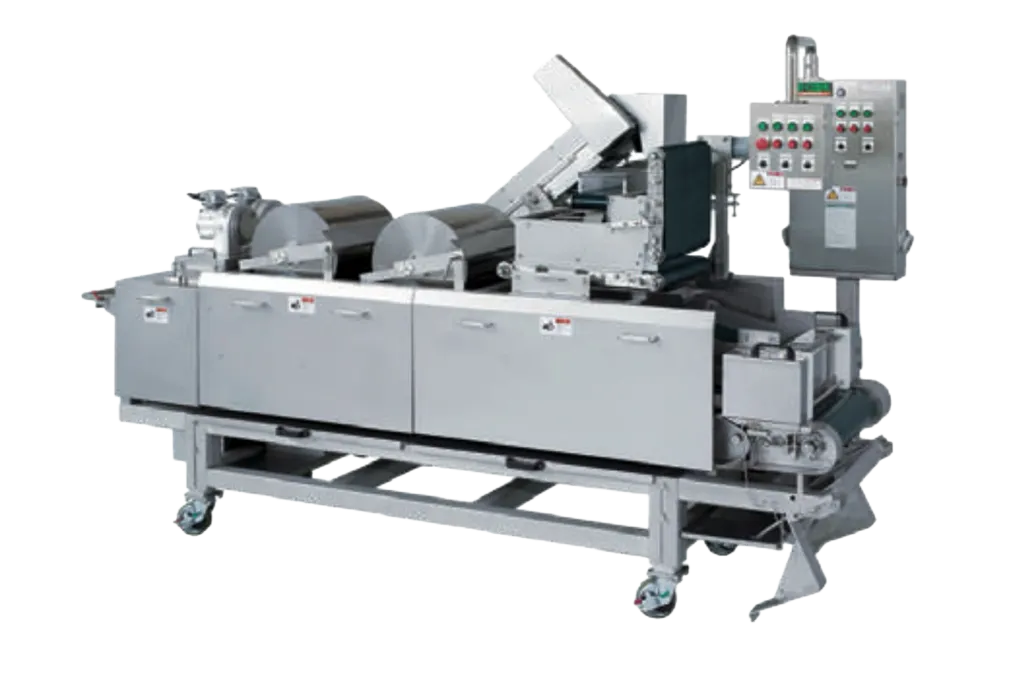 ベルトコンベヤと特殊粉落とし機構により、多様な粉付けが可能に。洗浄性に優れたマルチタイプの生パン粉付け機です。ベルト搬送方式による生パン粉・ドライパン粉兼用の大型パン粉付け機です。とんかつやパティ、バーガー、イカリング、ナゲット、鶏胸肉、チーズスティックなど幅広い商品にご使用いただけます。衛生的な食品用ベルトで搬送されたパン粉と、上部より振り掛けられるパン粉で商品をきれいに包み込み、2個の大径押さえローラーでパン粉をしっかり付着させます。片持ちフレーム構造により、機械内部のすみずみまで洗浄可能です。
