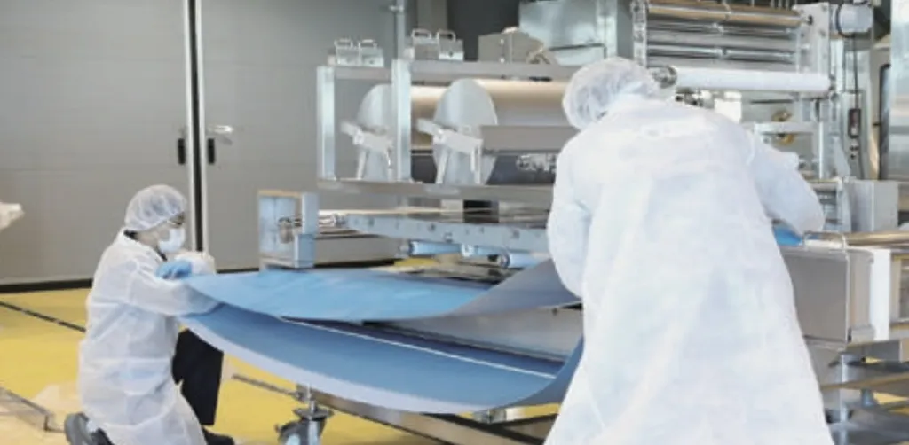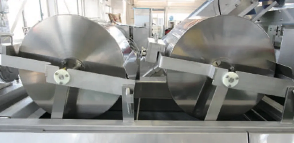ベルトコンベヤと特殊粉落とし機構により多様な粉付けが可能に
