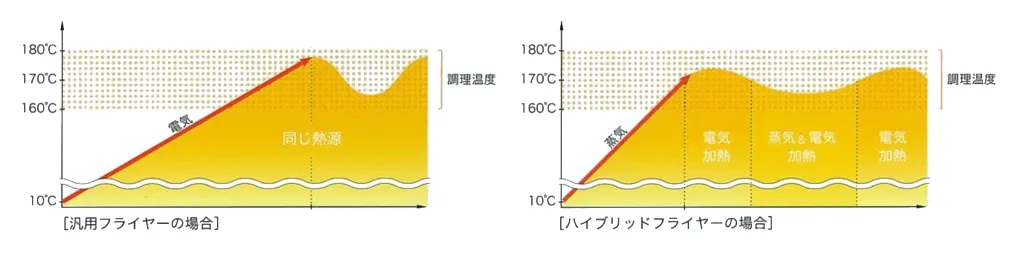 ハイブリッドフライヤーが「省エネ」なのは、低温では蒸気加熱、高温では電気加熱を採用しているからです。さらにコンピュータが温度を監視して加熱源を切り替えます。蒸気で温めると、たった数分で調理温度に到達し、電気の使用量を大幅にカットできます。
