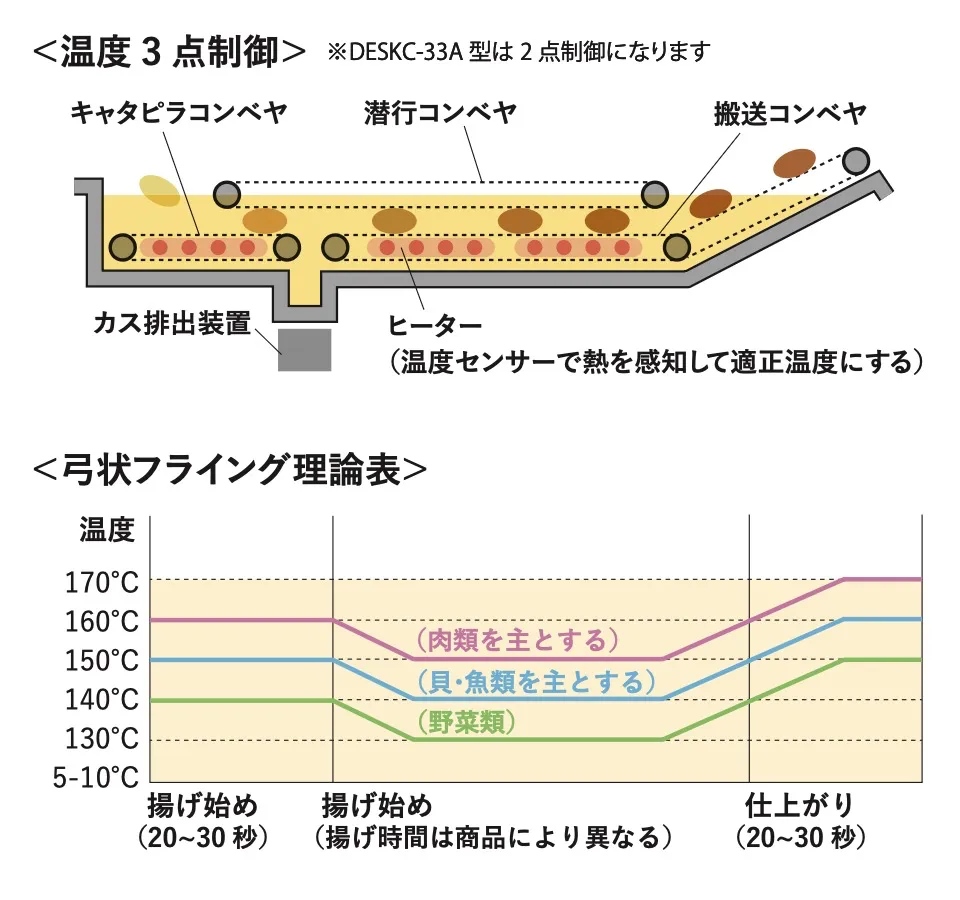 そのため、沈殿したコロッケやトンカツ等の揚げカスを炭化させず、油の劣化や変色を防ぎます。