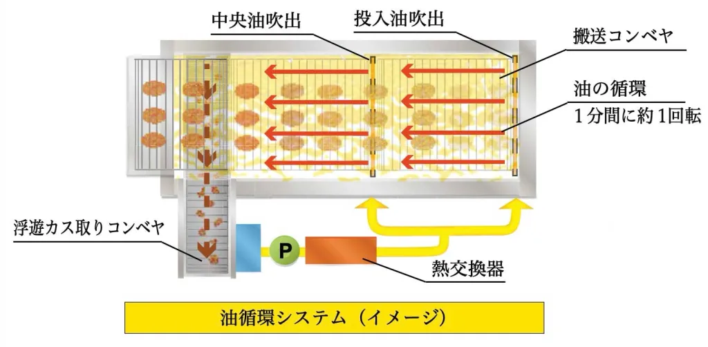 熱交換器で加熱された油を循環させ、投入部より吹き出して大容量の熱量を供給することで、食材投入部での温度ドロップがなく、常に安定した状態で食材表面をしっかりと固めます。