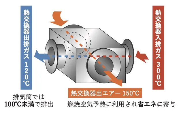 本機はこの燃焼排ガスの熱量を熱交換器で回収 し、燃焼空気の予熱に有効利用することで加熱効率を高めます。これにより直火式でありながら高い熱効率を実現し、省エネ に貢献します。