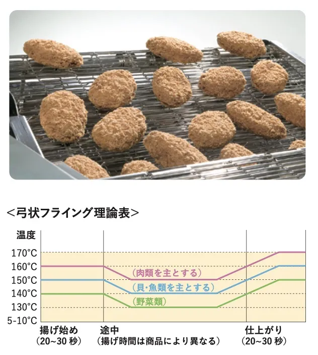 各ゾーンの調理温度は、揚げ物を最もおいしく仕上げる条件である 「弓状フライング理論」 に沿って設定され、油切れのよいカラっとした 仕上がりを実現します。