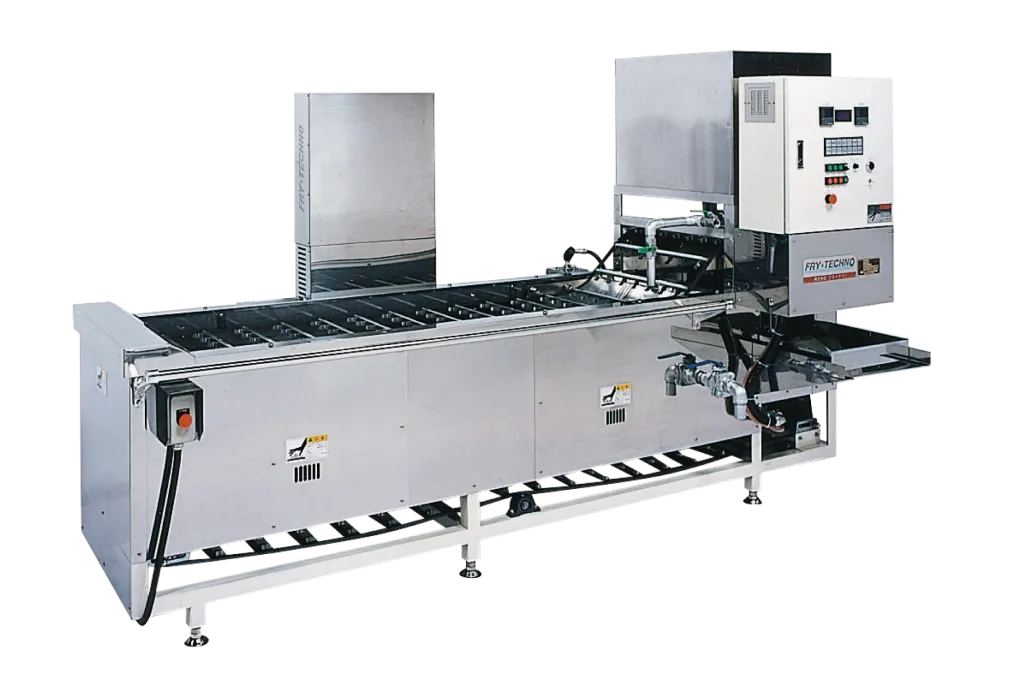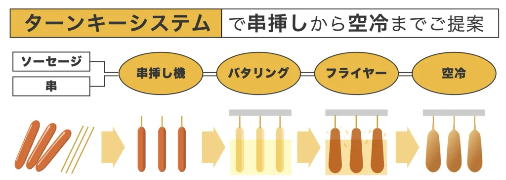 特殊クリップを使用した搬送方式で、商品を立てた状態で揚げる事が可能なコーンドッグ用フライヤーです。串挿し方法とフライヤー搬送方法はお互いに関連しておりますので、バッター付け装置を含めた一連のラインプランニングをご提案致します。