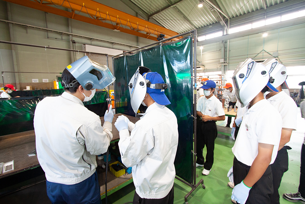 まず最初に当社事業や、作っている製品など会社概要についての簡単な説明を行った後、機械が出来ていく工程を追うように設計→板金→溶接→組立と各現場を巡り、話を聞いたり見るだけでなく実際に機械を操作したり、溶接作業を体験するなど、モノづくりの魅力と楽しさを知るきっかけとなれるよう、ご案内をさせていただきました。